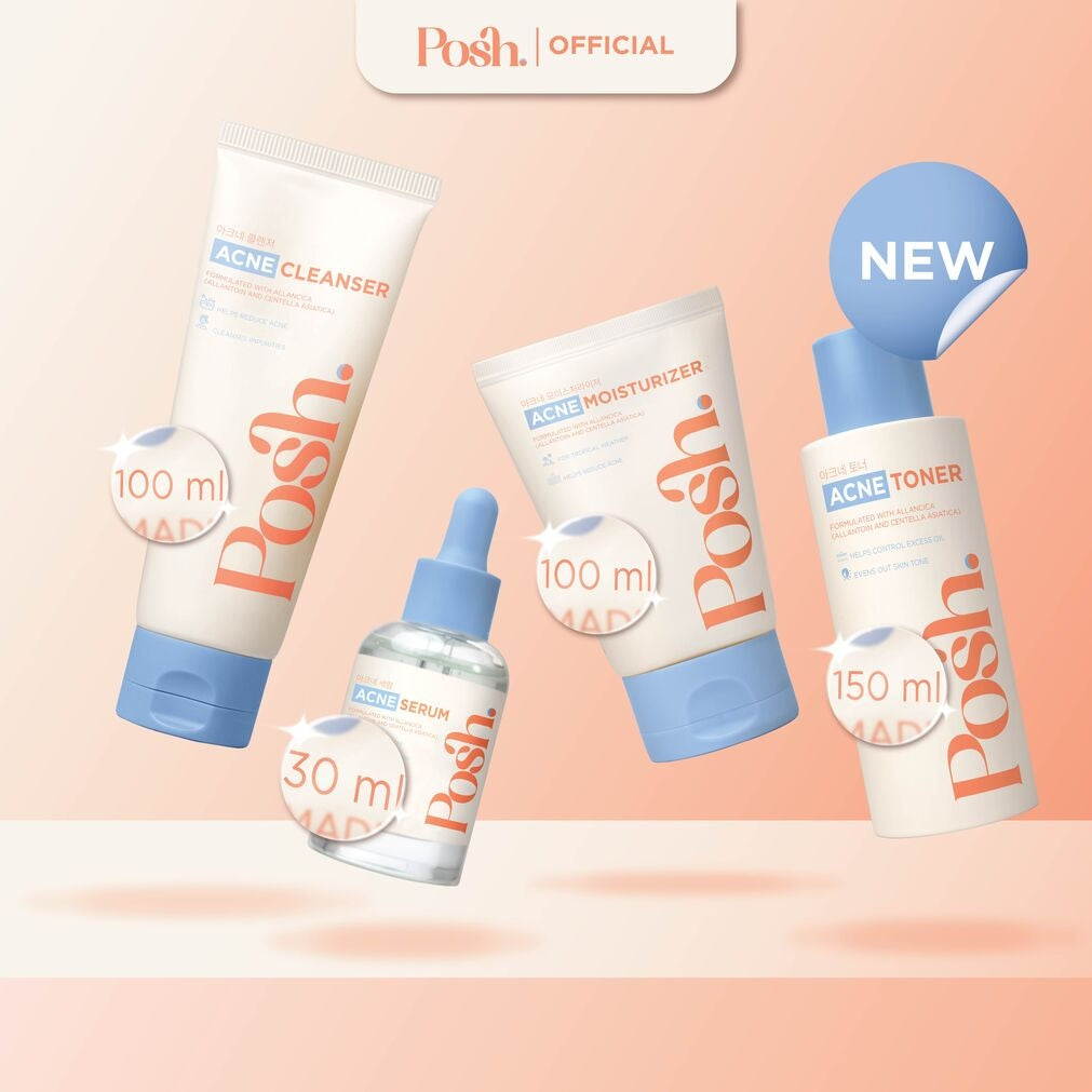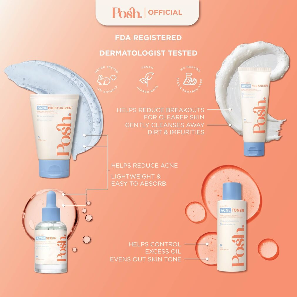 Breakouts showing up out of nowhere? Oily T-zone acting up? Skin looking dull, irritated, or uneven from our humid PH weather? Don’t stress, beshy! Your complete skincare routine is here. The Posh Acne Cleanser + Toner + Serum + Moisturizer Set is your 4-step system for clearer, calmer, and more radiant skin.
